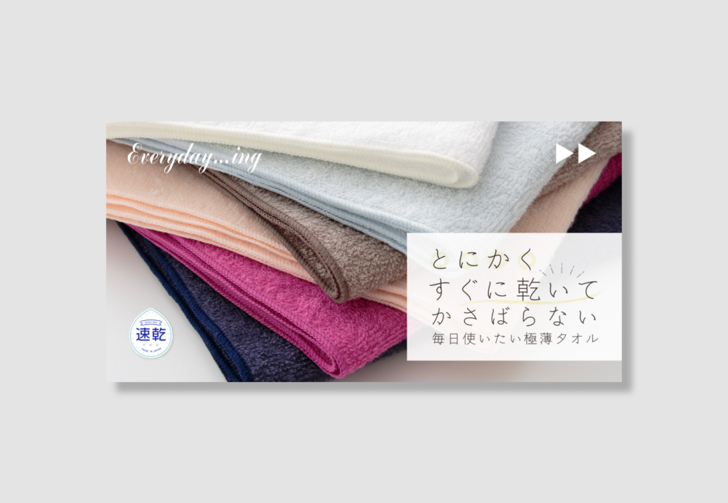 セールのイメージにもなるように、セールのたびに同じタオルの画像をあえて使い、意識に刷り込む工夫をしています。